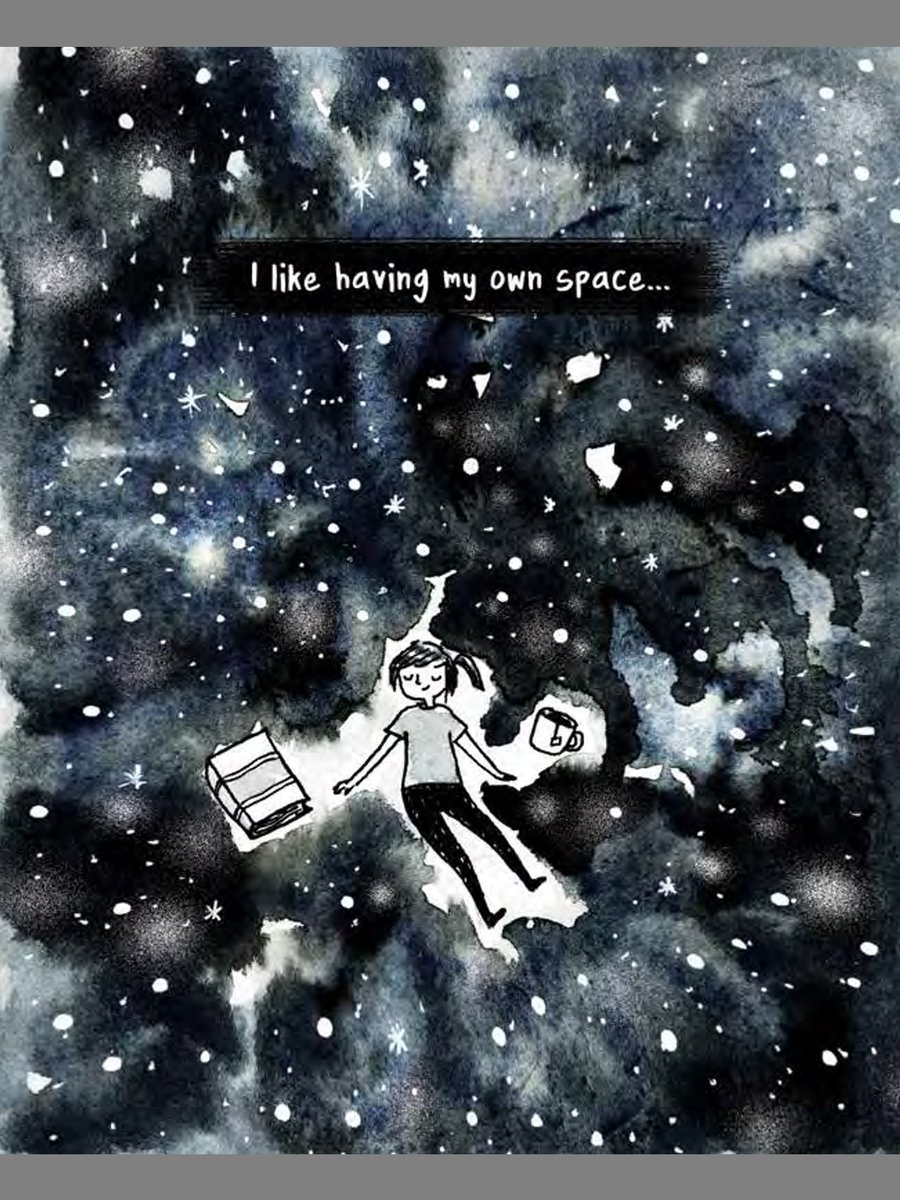 Debbie's drawings are charming and engaging, deceptively simple: chronicling her life from postgraduate studies through relationships, marriage and first employment. I related so strongly to her feelings and experiences. It's incredibly heartening to know I'm not the only person to feel secretly relieved when social events are cancelled, or to overthink previous conversations, or to dread making a work phone call in a room full of people. After reading the section where Debbie takes an online personality test, I was inspired to take one myself. (I came out as an INFP, if anyone's interested, which rings fairly true.) Ultimately there is a very affirming message here of "it's OK to be you". It's OK to be quiet. It's OK to need (lots of) time alone to rest and recharge. It doesn't make you an inadequate human being. Even if that's what you've always thought. Introverts of the world - unite! (Oh, wait.)
